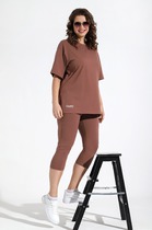 Комплект женский, состоящий из рубашки и юбки. Рубашка с длинным цельнокроеным рукавом, заканчивающимся притачной манжетой (на застежку пуговицу). Воротник стояче-отложной. Перед рубашки с застежкой на планку, петли и пуговицы. Перед с накладными карманами. В боковых швах разрезы. Юбка прямого силуэта, длинная, состоящая из двух видов ткани. Выполнена, как имитация двойной юбки. Верх юбки на обтачке, застежка - молния в среднем шве спинки. Нижняя юбка с высокими боковыми разрезами.