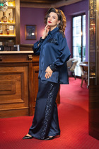 Комплект: блузка + юбка. Комплект выполнен из трикотажного полотна с люрексом. Блузка приталенного силуэта длиной до линии талии. Спереди средний шов с застежкой на потайную молнию, перекрут со сборками по боковыми швам. Спинка цельная. Рукав втачной одношовный, длиной до линии локтя. Блузка с плечевыми накладками, на подкладке. Юбка длиной макси, зауженная к низу. Переднее и заднее полотнища цельные. В левом боковом шве разрез. Юбка на цельнокроеном поясе. Юбка без подкладки.