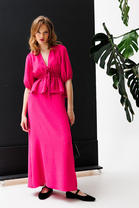 Комплект: блузка + юбка. Комплект выполнен из плательной ткани. Блузка полуприлегающего силуэта, длиной выше линии бедер, по линии талии собрана на венгерку. Горловина V-образной формы. Спереди застежка встык на завязки. Спинка длиннее переда. Рукав втачного покроя, одношовный, длиной чуть ниже линии локтя. Низ рукава присборен и обработан эластичной тесьмой. Юбка расширена к низу, на притачном поясе, длиной миди. В среднем шве полотнища спинки застежка в виде потайной молнии. Пояс застегивается на пуговицу. Юбка на отлетной по низу подкладке.