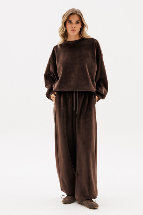 Комплект: джемпер+брюки. Комплект выполнен из двустороннего велюра в мелкий рубчик. Джемпер О-образного силуэта, покроя "oversize", длиной до линии бедер. Перед и спинка цельные. Горловина округлой формы, обработана бейкой. Плечевой шов удлинен. Рукав рубашечного покроя, одношовный. Низ рукава на манжете. Верхняя часть рукава переходит в кокетку переда т спинки и доходит до горловины. По низу джемпера обработан пояс. Пояс, манжеты, верхняя часть рукава и бейка горловины выполнены из основной, но без рубчика. Брюки на притачном поясе с эластичной тесьмой, прямого силуэта, длиной в пол, покроя "oversize". Боковой шов заменен лампасом. В швах лампаса карманы. Сзади накладные карманы. В пояс протянут шнур с наконечниками. По низу брюк втянута эластичная тесьма с фиксаторами. Лампасы и пояс выполнены из основной ткани, но без рубчика.