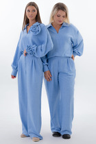 Костюм женский 2х предметный состоит из жакета и брюк. Жакет прилегающего кроя, по полочке жакета расположены прорезные карманы с клапанами. Горловина - отложной воротник с лацканами. Рукав втачной длинный.  Застежка петля-пуговица. Брюки прямого кроя с высокой посадкой, на притачном поясе со вставками эластичной тесьмы.  в боковых швах брюк -палаццо имеются карманы. Застежка  молния на гульфике, петля-пуговица. Жакет без подкладки.