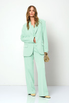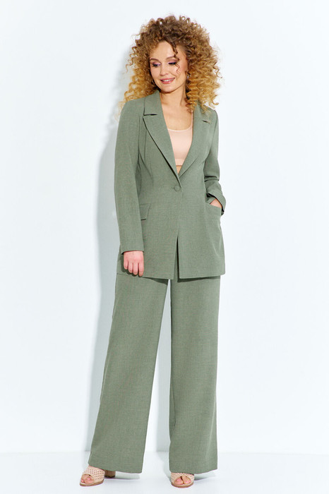 Костюм женский 2х предметный состоит из жакета и брюк. Жакет прилегающего кроя, по полочке жакета расположены прорезные карманы с клапанами. Горловина - отложной воротник с лацканами. Рукав втачной длинный.  Застежка петля-пуговица. Брюки прямого кроя с высокой посадкой, на притачном поясе со вставками эластичной тесьмы.  в боковых швах брюк -палаццо имеются карманы. Застежка  молния на гульфике, петля-пуговица. Жакет без подкладки.