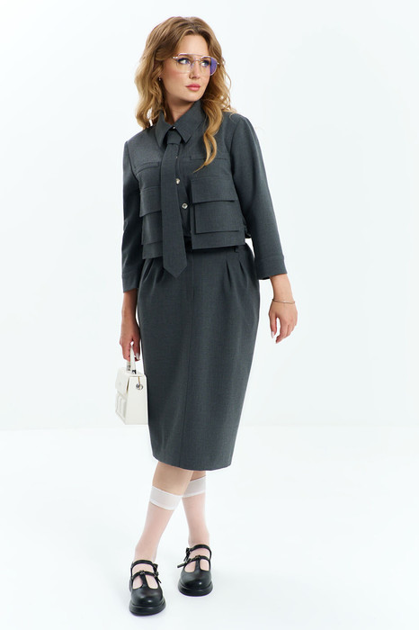 Костюм 3-х предметный, состоит их рубашки, юбки, галстука. Выполнен из костюмной ткани. Рубашка прямого кроя без подкладки, по полочке расположены накладные декоративные элементы и карманы с клапаном. спинка с отрезной кокеткой и таллиевыми выточками. Воротник отложной на стойке, рукав втачной 7/8. Юбка изделия на притачном поясе с резинкой, застежка потайная молния, по низу юбки расположена шлица, юбка с подкладкой.
