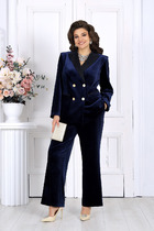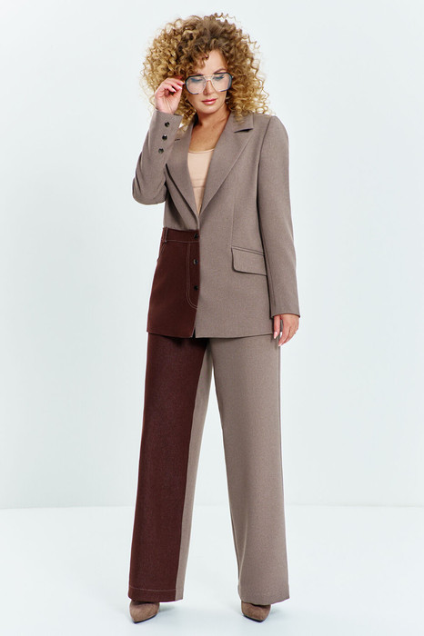 Костюм женский выполнен из сочетания костюмной ткани и джинса, состоит из жакета и брюк, жакет полуприлегающего кроя с имитацией на полочке - "джинсы" и функциональными карманами, воротник V-образный, отложной . Рукав длинный втачной.Жакет с полной подкладкой. Брюки завышенной посадки на притачном поясе с резинкой в боковых швах брюк расположены карманы, застежка молния на гульфике.
