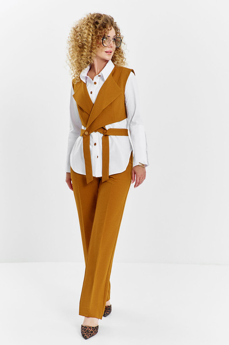 Костюм женский 3х предметный состоит тз брюк блузы и жилета,  блуза выполнена из хлопковой ткани, полуприлегающего кроя , горловина воротник на стойке, рукав втачной с высокой манжетой по низу рукава, застежка - планка с петлей пуговицей, низ фигурный. Жилет свободного кроя, укороченный, воротник отложной с лацканами, по переду жилета съёмный пояс, с застежкой петли -пуговицы. Брюки средней посадки, прямого кроя на притачном поясе с резинкой, в боковых швах имеются карманы, застежка петля- пуговица и молния на гульфике.