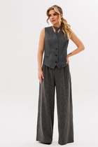 Костюм женский 3х предметный состоит тз брюк блузы и жилета, блуза выполнена из хлопковой ткани, полуприлегающего кроя , горловина воротник на стойке, рукав втачной с высокой манжетой по низу рукава, застежка - планка с петлей пуговицей, низ фигурный. Жилет свободного кроя, укороченный, воротник отложной с лацканами, по переду жилета съёмный пояс, с застежкой петли -пуговицы. Брюки средней посадки, прямого кроя на притачном поясе с резинкой, в боковых швах имеются карманы, застежка петля- пуговица и молния на гульфике