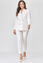 Костюм женский двухпредметный состоит из блузона и брюк. Блузон женский ассиметричного кроя, свободного прилегания. Блузон ассиметричного кроя, горловина округлая, по полочке расположена ассиметричная планка и декоративный хлястик с пряжкой. Рукав спущенный широкий укороченный с широкой манжетой по низу. Брюки асимметричного кроя, завышенной посадки, на притачном поясе с резинкой по переду брюк расположены функциональные карманы. !!! брюки разрезные по передней и задним частям брюк расположены декоративные прорези (обработанные).