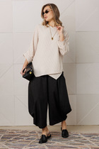Брюки Палаццо- легендарный крой, который визуально делает ноги бесконечными. Высокая посадка на поясе с резинкой, и струящаяся ткань создают летящую походку, а глубокий черный цвет придает образу глубину и загадочность. застежка брюк молния на гульфике и петля- пуговица, в боковых швах имеются функциональные карманы с отрезным бочком.