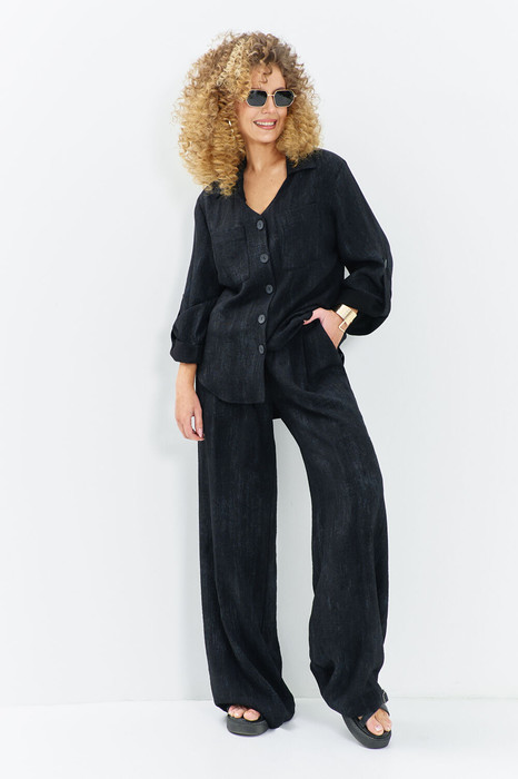 Брюки Палаццо- легендарный крой, который визуально делает ноги бесконечными. Высокая посадка на поясе с резинкой, и струящаяся ткань создают летящую походку, а глубокий черный цвет придает образу глубину и загадочность. застежка брюк молния на гульфике и петля- пуговица, в боковых швах имеются функциональные карманы с отрезным бочком.