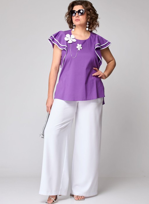 Костюм женский двухпредметный нарядно-повседневнй состоящий из блзы и брюк. Блуза прямого силуэта с фигурным низом, выполнена из хлопка. Вырез горловины круглый на обтачке, рукава втачные двойные "крылышки". В боковых швах обработаны разрезы. Декором служит контрасная окантовка на рукавах и съемная отделочная брошь в виде двух цветов с цепочкой. Брюки "палаццо" на притачном поясе. Пояс по кругу на широкой резинке, в боковых швах обработаны карманы.