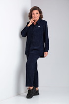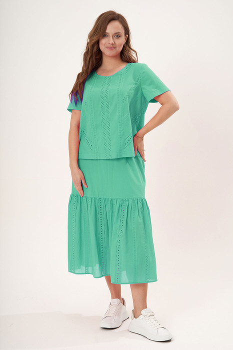 Летний лёгкий костюм состоит из блузы и юбки, выполненный из хлопкового шитья в сочетании с однотонной тканью. Блуза упрямленного силуэта с круглым вырезом горловины и застёжкой на планке по центру спинки.