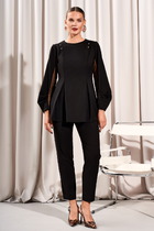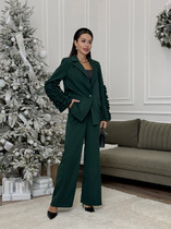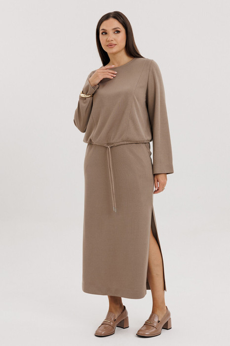 Свободный джемпер упрямлённого силуэта, втачного покроя с регулирующей кулисой по низу. Полочка с боковым вертикальным рельефом. Спинка с вертикальным рельефом, средним швом и застёжкой на отелочную молнию. Рукав с цельнокроеной манжетой. Юбка макси, на притачном эластичном поясе, с наклонными боковыми карманами и эффектным разрезом сбоку.