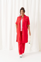 Свободный силуэт, рубашечный покрой, рукав длиной 3/4, эффектная драпировка по переду и кокетливый пояс-завязка по спинке.