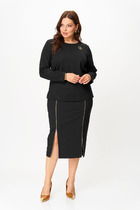 Свободная блуза сложного комбинированного покроя с фигурным низом и эффектными разрезами. Рукав длиной 3/4. Юбка-рыбка, на эластичном поясе, с застежкой на потайную молнию в боковом шве. Модель дополнена кожаным поясом-шнуром.