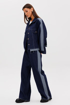 Свободный силуэт, рубашечный покрой, втачной воротник, рукав с притачной манжетой. Полочка с отрезной кокеткой, рельефами и карманом с клапаном. Спинка с отрезной кокеткой и рельефами. Рукав с локтевым швом и разрезом в нём, отделочным лампасом по центру рукава из контрастного денима, мягкой складкой и притачной манжетой. По низу куртки - притачная отделочная полоса в цвет лампаса. Застёжка центральная на петли и пуговицы.