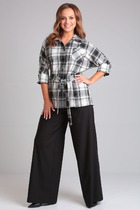 Брюки классические, прямые, на отрезном поясе со шлевками, эластичном в области спинки. Передние половинки брюк с талиевыми вытачками и наклонными боковыми карманами.