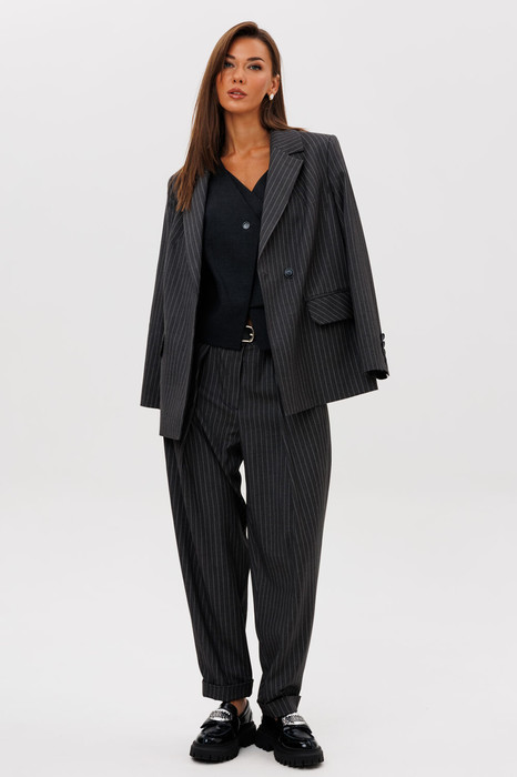 Жакет свободного упрямленного силуэта, втачного покроя, со смещенной застежкой и классическим английским воротником. Полочка с нагрудной вытачкой от линии лацкана, меняющей направление полоски в верхней части, прорезным карманом с рамкой и клапаном.