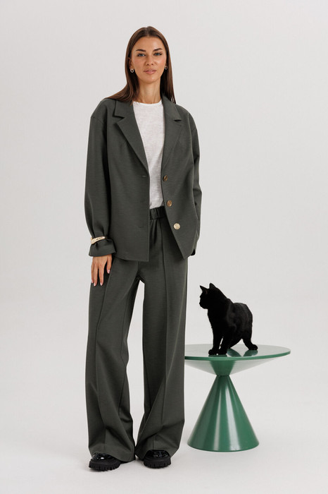 Универсальный глубокий оттенок ткани делает костюм практичным и актуальным в любое время года.