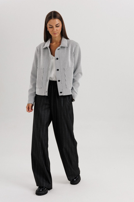 Жакет укороченной длины выполнен из лёгкой ткани с графическим узором, имеет отложной воротник и аккуратную застёжку на пуговицы. Брюки прямого силуэта со стрелками и комфортной посадкой по талии визуально вытягивают силуэт и добавляют стройности.