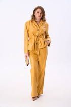 Костюм с жилетом - прекрасное решение для смелых экспериментов. Жилет полуприлегающего силуэта с асимметричной застёжкой, фигурной линией низа и регулирующийся кулисе по спинке. Полочки с отрезным бочком и нагрудными вытачками, спинки - с центральным швом, отрезным бочком и регулирующийся кулисой с фиксаторами. Брюки "баррел" на притачном поясе со шлёвками (эластичном в области спинки), с наклонными карманами , мягкими складками защипами по верху брюк и вытачками по низу. Джемпер трикотажный, с длинным рукавом, полуприлегающего силуэта.