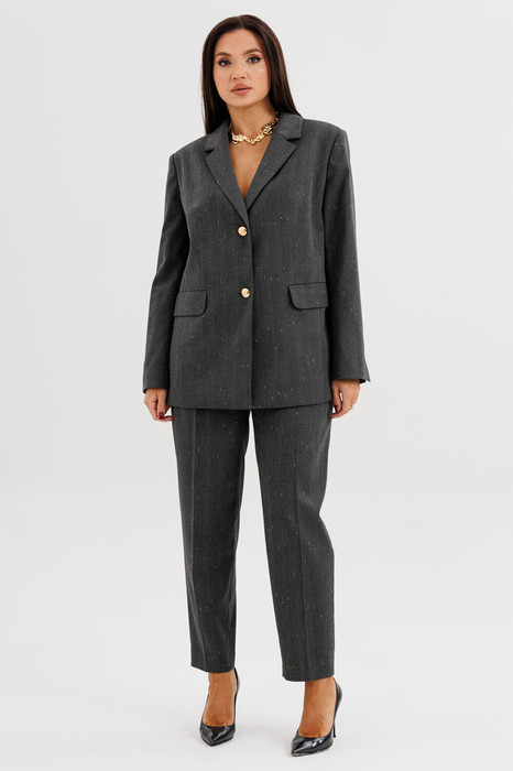 Жакет свободного расширенного силуэта, втачного покроя с центральной застёжкой и классическим английским воротником. Полочка с отрезным бочком, нагрудной вытачкой и прорезным карманом с клапаном. Спинка с центральным швом, шлицей и отрезным бочком. Рукав двухшовный с отлетной шлицей.