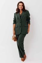 Жакет свободного расширенного силуэта, втачного покроя с центральной застёжкой и классическим английским воротником. Полочка с отрезным бочком, нагрудной вытачкой и прорезным карманом с клапаном. Спинка с центральным швом, шлицей и отрезным бочком. Рукав двухшовный с отлетной шлицей.