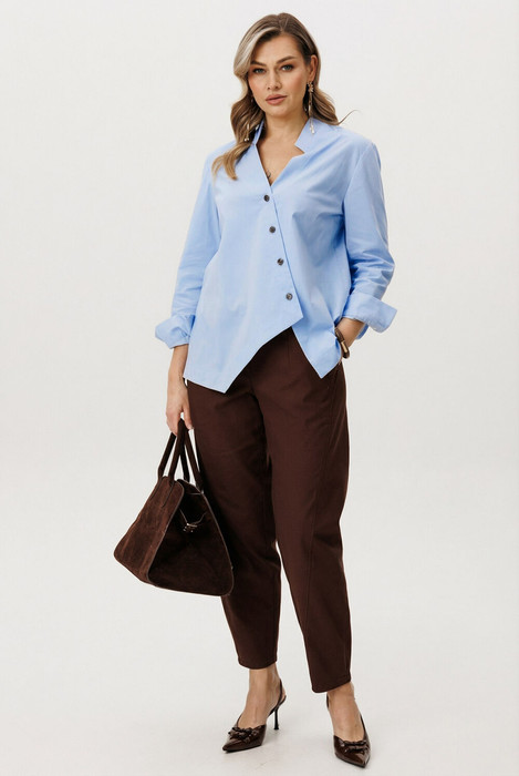Рубашка выполнена из хлопкового полотна, что обеспечивает отличную воздухопроницаемость и лёгкость. Асимметричная линия низа и аккуратный ворот придают модели современный характер.