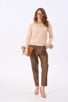 Брюки - прямого силуэта, в боковом шве - карманы, пояс на резинке, низ брюк обработан швом в подгибку, с закрытым срезом. В боковых швах лампасы из отделочной ткани."