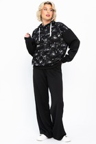 В этом образе сочетаются комфорт и выразительность: легкий джемпер свободного силуэта с мягко спущенными рукавами будто обнимает фигуру, даря ощущение свободы движений. Воротник-стойка с аккуратной молнией намекает на спортивную эстетику, а кокетки из трикотажной ткани на спинке и полочке создают эффектные акценты, подчеркивая архитектуру кроя. Декоративная печать на подрезах придаёт образу творческую дерзость, а лампас на рукавах из отделочной ткани — динамику и ритм.