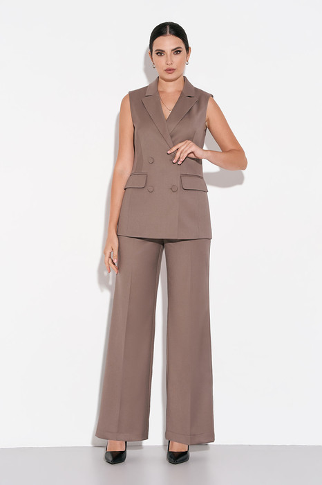 Женский деловой костюм, состоящий из жилета и брюк, выполнен из костюмной ткани высокого качества. Жилет классический двубортный полуприлегающего силуэта на подкладке с функциональными прорезными карманами по переду, воротником пиджачного типа и застежкой на петли и пуговицы. Брюки классические со стрелками полуприлегающего силуэта в области талии и бедер, прямые к низу. Брюки застегиваются на молнию, петлю и пуговицу.