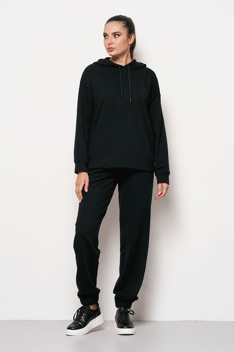 Спортивный женский костюм свободного силуэта, состоящий из худи с капюшоном и брюк, выполнен из высококачественного футера 3-х нитки класса "пенье". Лицевая сторона ткани гладная, изнанка - петлеобразная. Худи с капюшоном свободного силуэта со спущенной линией плеча и длинными рукавами с углубленной проймой. Низ худи и рукавов выполнены с планками без резинок, в капюшон вставлен декоративный шнур. Брюки (спортивные штаны) свободного силуэта с функциональными карманами в боковых швах заужены к низу, пояс брюк и отрезные манжеты по низу полностью на резинке.