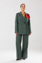 Костюм женский жакет+ юбка приталенного силуэта, выполнен из текстильного полотна костюмно- плательной группы. Перед с нагрудной вытачкой идущей от бокового шва, накладными карманами с клапаном. На планке расположены 5 пуговиц. Спинка со средним швом. По низу жакета обработан пояс. Воротник стояче отложной. Рукава одношовные заканчивающиеся манжетой. Юбка прямая, на поясе спереди застёгивается на пуговицы. По переду расположены накладные клапаны. На клапанах расположены декоративные пуговицы в цвет основных.