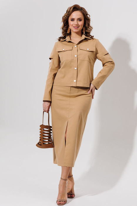 Юбка прямая с карманами на поясе,  спереди застёгивается на молнию. По среднему шву расположен разрез.