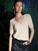 Нарядный женский костюм выполнен из фактурной ткани с  добавлением натуральных волокон. Костюм состоит из жакета и  юбки. Жакет полуприлегающего силуэта с двубортной застёжкой на четыре петли и пуговицы.