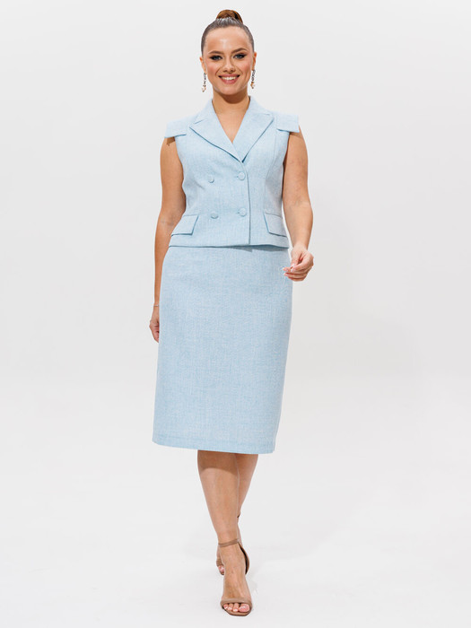 Нарядный женский костюм выполнен из фактурной ткани с  добавлением натуральных волокон. Костюм состоит из жакета и  юбки. Жакет полуприлегающего силуэта с двубортной застёжкой на четыре петли и пуговицы.