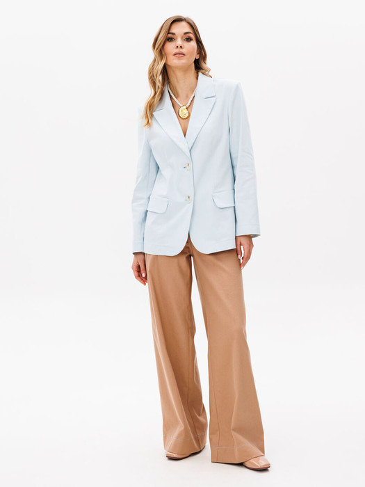 Костюм состоит из жакета и брюк из джинсовой хлопковой ткани. Жакет полуприлегающего силуэта с воротником пиджачного типа. Застежка однобортная на две пуговицы. Перед с талиевой вытачкой, рельефом и декоративным клапаном. Спинка с рельефами из проймы и средним швом. Рукав втачной двухшовный. Брюки расширеные книзу на притачном поясе. По поясу настрочены шлевки. По передним и задним частям брюк вытачки. На задних частях брюк настрочены карманы. Карманы, вытачки, пояс, низ брюк отделаны отделочной строчкой. Длина жакета - 68см, длина рукава жакета - 60 см, длина брюк с учетом пояса -107 см