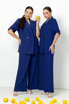 Костюм состоит из жакета и брюк из джинсовой хлопковой  ткани. Жакет полуприлегающего силуэта  с  воротником пиджачного типа.  Застежка однобортная на две пуговицы.  Перед с талиевой вытачкой, рельефом и декоративным клапаном. Спинка с рельефами из проймы и средним швом.  Рукав втачной двухшовный. Брюки расширеные книзу на притачном поясе. По поясу настрочены шлевки. По передним и задним частям брюк вытачки. На задних частях брюк настрочены карманы. Карманы, вытачки, пояс, низ брюк отделаны отделочной строчкой. Длина жакета - 68см, длина рукава жакета - 60 см, длина брюк с учетом пояса -107 см