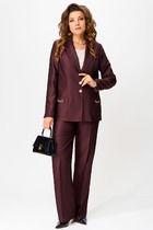 Костюм состоит из жилета и брюк, выполеных из костюмной ткани. Жилет полуприлегающего силуэта  с воротником пиджачного типа.  Перед с рельефами, талиевой вытачкой и декоративным клапаном.  Застежка центральная однобортная на 2 петли и пуговицы. Спинка со средним швом и рельефами. Вдоль оката рукава выполнена декоративная планка. К жилету прилагается тонкий пояс из основной ткани.  Брюки расширеные книзу с притачным поясом. Спереди застежка гульфик на молнии и с петлей и пуговицей по поясу. По задней частям брюк вытачки. В боковых швах карманы с наклонным входом. По поясу широкие шлевки. Брюки со срелками застроченными по переду и заутюженными сзади. Длина жилета - 71 см, длина брюк с учетом пояса - 109 см.