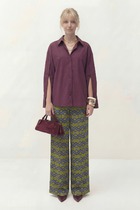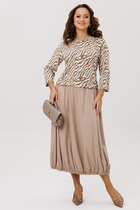Джемпер прямого силуэта с воротником поло из плотной хлопковой ткани "двухнитка". Рукав втачной одношовный. По низу изделия, по низу рукава и по воротнику проложена отделочная строчка. Брюки палаццо с притачным поясом из мягкой вельветовой ткани. Спереди застежка гульфик на молнии и петлей и пуговицей по поясу. По задней частям брюк вытачки. Пояс с резинкой в боковых частях. Брюки с заутюженными стрелками. Длина джемпера- 66 см, длина рукава - 60 см. Длина брюк с учетом пояса - 109 см.