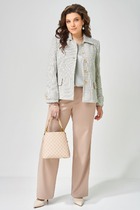 Костюм состоит из джемпера и брюк. Джемпер приталенного силуэта с воротником поло из  трикотажного полотна. Рукав втачной одношовный.Брюки расширеные книзу на притачном поясе. По поясу настрочены шлевки. По передним и задним частям брюк вытачки. На задних частях брюк настрочены карманы. Карманы, вытачки, пояс, низ брюк отделаны отделочной строчкой. Длина брюк с учетом пояса - 109 см, длина джемпера - 57 см, длина рукава -  27 см.