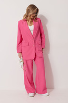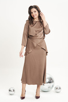 Костюм состоит из блузки и брюк. Блузка оригинальная приталенного силуэта из вельветовой ткани. Перед с подрезом под грудью, сборкой в районе груди и талиевыми вытачками. Затсежка на петли и пуговицы. Горловина V-образной формы. Спинка с талиевыми вытачками. Рукав втачной со сборкой по окату и с манжетой по низу. Манжета высокая с двумя петлями и пуговицами. Длина блузки - 63 см, длина рукава блузки - 64 см. Брюки палаццо с притачным поясом из мягкой вельветовой ткани. Спереди застежка гульфик на молнии и петлей и пуговицей по поясу. По задней частям брюк вытачки. Пояс с резинкой в боковых частях. Брюки с заутюженными стрелками. Длина брюк с учетом пояса - 109 см.