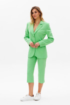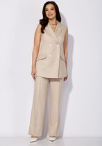 Костюм состоит из джемпера и юбки. Джемпер приталеного силуэта с воротником поло из трикотажного полотна. Рукав втачной одношовный. Длина джемпера - 57 см, длина рукава - 60 см. Юбка прямого силуэта выполненная из мягкой вельветовой ткани. Передняя честь юбки с вытачками, со средним швом и застежкой гульфиком на молнии и щлицей спереди. Задняя часть юбки с вытачками. Юбка на притачном поясе с затежкой на петлю и пуговицу спереди и резинками по бокам. Юбка на подкладке. Длина юбки с учетом пояса - 90 см.
