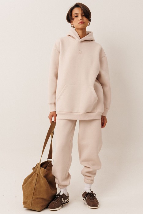 Женский тёплый уютный костюм. Подойдет для прогулок и отдыха. Изготовлен из футера с начесом, состоит из худи, покроя оверсайз и джоггеров.