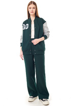 Современный женский костюм, состоящий из бомбера и брюк. Бомбер свободного силуэта, выполнен из ткани-футера двух цветов с застежкой на металлические кнопки. На переде функциональные прорезные карманы и дизайнерская нашивка в виде букв “GO” на правом переде.  Низ изделия, горловина, манжеты рукавов выполнены из ткани-компаньона кошкорсе. Брюки прямого силуэта с притачным поясом, резинкой внутри. Передняя половинка брюк с удобными боковыми карманами.
