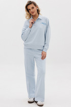 Современный женский костюм, состоящий из бомбера и брюк. Бомбер свободного силуэта, выполнен из ткани-футера двух цветов с застежкой на металлические кнопки. На переде функциональные прорезные карманы и дизайнерская нашивка в виде букв “GO” на правом переде. Низ изделия, горловина, манжеты рукавов выполнены из ткани-компаньона кошкорсе. Брюки прямого силуэта с притачным поясом, резинкой внутри. Передняя половинка брюк с удобными боковыми карманами.