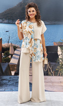 Жакет с центральной застежкой на петли и пуговицы, втачным воротником и отложным лацканом пиджачного типа. По переду нагрудные вытачки и накладные карманы. Спинка со средним швом. Брюки- с отрезным поясом, на поясе расположены шлевки. По спинке пояс присборен на резинку. По боковым швам расположены карманы.  Вход в карман наклонный к боковому шву. По передним половинкам, по шву притачивания пояса- односторонние складки. Застежка гульфик. Комплект со съемным поясом.