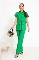 Жакет с центральной застежкой на петли и пуговицы, втачным воротником и отложным лацканом пиджачного типа. По переду нагрудные вытачки и накладные карманы. Спинка со средним швом. Брюки- с отрезным поясом, на поясе расположены шлевки. По спинке пояс присборен на резинку. По боковым швам расположены карманы. Вход в карман наклонный к боковому шву. По передним половинкам, по шву притачивания пояса- односторонние складки. Застежка гульфик. Комплект со съемным поясом.