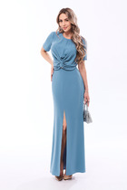 Блузка, без воротника, с круглым вырезом горловины, застежкой на навесную петлю и пуговицу в среднем шве спинки. По переду со средним швом и декоративным узлом. По спинке со средним швом и резинкой по низу. Рукав втачной, короткий. Юбка прямая, без пояса, верх обработан обтачками. Застежка на потайную молнию в среднем шве спинки. Переднее полотнище со средним швом, заканчивающимся разрезом.