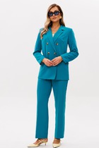 Туника с центральной застежкой на петли и пуговицы, втачным воротником с отрезной стойкой. По переду нагрудные вытачки и клапаны, расположенные на уровне груди. Спинка с отрезной кокеткой. По проймам- втачные крылышки, зафиксированные к плечевому шву патой с петлей и пуговицей. На боковых швах расположены шлевки и съемный пояс. Брюки- с отрезным поясом. По спинке пояс присборен на резинку. По боковым швам расположены карманы. Вход в карман наклонный к боковому шву. Застежка гульфик. Комплект со съемным поясом.