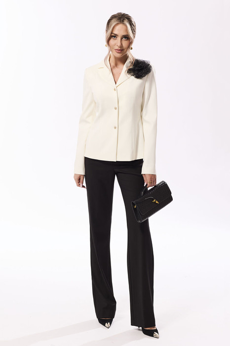 Жакет с центральной застежкой на петли и пуговицы, отложным воротником и лацканами пиджачного типа. По переду с рельефами, выходящими из проймы и из плеча. Спинка со средним швом, рельефами, выходящими из проймы. Рукав втачной, длинный. Брюки без пояса, верхний срез обработан обтачками, в области спинки брюки присборены на резинку. В боковых швах расположены карманы. Вход в карман наклонный к боковому шву. Застежка гульфик.